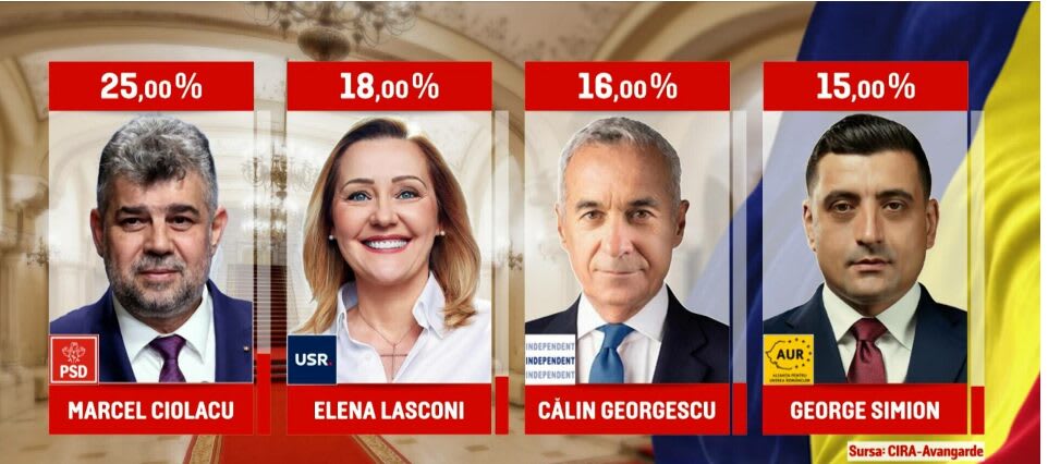 REZULTATE EXIT-POLL-URI la alegerile prezidențiale 2024 - primul tur. Ciolacu și Lasconi în turul doi - BotoșaniExpres Rezultat exit-poll Avangarde și CIRA: 1. Marcel Ciolacu – 25% 2. Elena Lasconi – 18% 3. Călin Georgescu – 16% 4. George Simion – 15% 5. Nicolae Ciucă – 14% 6. Mircea Geoană – 5% 7. Kelemen Hunor – 4% 8. Cristian Diaconescu – 2% * Notă: Rezultatele finale vor fi comunicate de Biroul Electoral Central după centralizarea tuturor voturilor. No Result View All Result