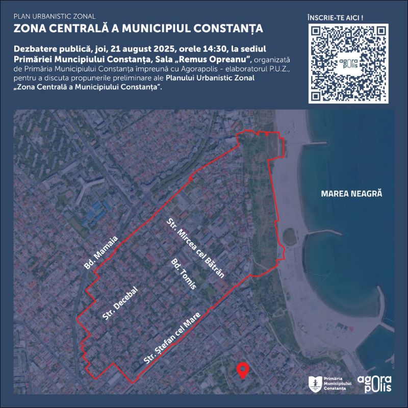 Primăria Municipiului Constanța invită cetățenii să participe la consultarea publică privind Planul Urbanistic Zonal al Zonei Centrale, care se desfășoară până pe 29 august 2025.