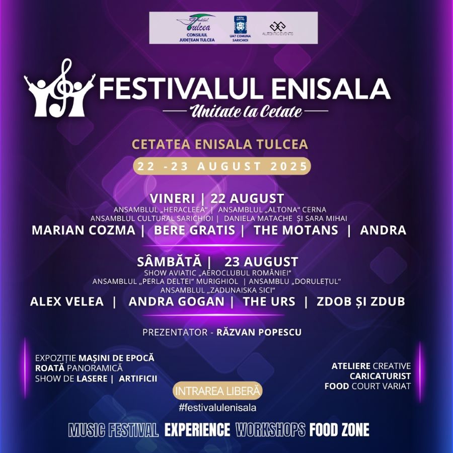 Festivalul Enisala – Unitate la Cetate va începe vineri, 22 august 2025, la ora 18.30, aducând împreună comunitatea și turiștii pentru două zile pline de spectacol și cultură. Programul de vineri va include ansambluri locale precum „Heracleea”, „Altona” și Ansamblul Cultural Sarichioi, precum și artiști cunoscuți, precum Andra și Bere Gratis. Evenimentul se va încheia cu un show de lasere și un impresionant foc de artificii.