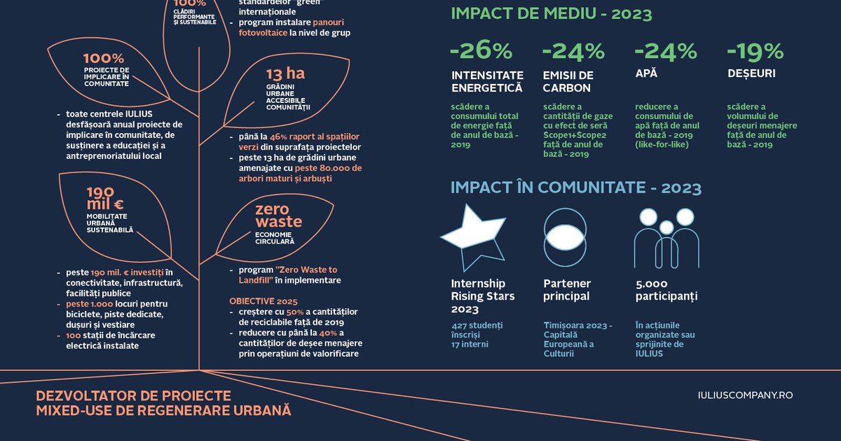 Grupul IULIUS continuă să revoluționeze urbanismul românesc prin inițiative de sustenabilitate impresionate. Cu o experiență de peste 25 de ani, compania a dezvoltat un portofoliu vast, incluzând peste 310.000 mp de retail și 242.000 mp de spații office. În 2023, IULIUS a raportat o reducere semnificativă a emisiilor de gaze cu efect de seră cu 24%, precum și o scădere a consumului total de energie cu 26%. Colaborarea cu International Finance Corporation a înregistrat realizări notabile, precum prima clădire din România care a obținut un credit verde în valoare de 72 de milioane de euro. Proiectele IULIUS nu se limitează la construcție, ci includ și implicarea în comunitate prin susținerea diverselor inițiative culturale și educaționale. În prezent, compania își concentrează eforturile pe dezvoltarea unor noi proiecte sustenabile în Cluj-Napoca și Constanța, care vor investi peste 1,3 miliarde de euro.