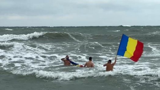 Trei constănțeni au înotat în mare cu steaguri tricolore de Ziua Națională