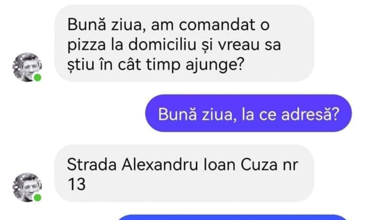 „- Bună ziua, am comandat o pizza la domiciliu și vreau să știu în cât timp ajunge?